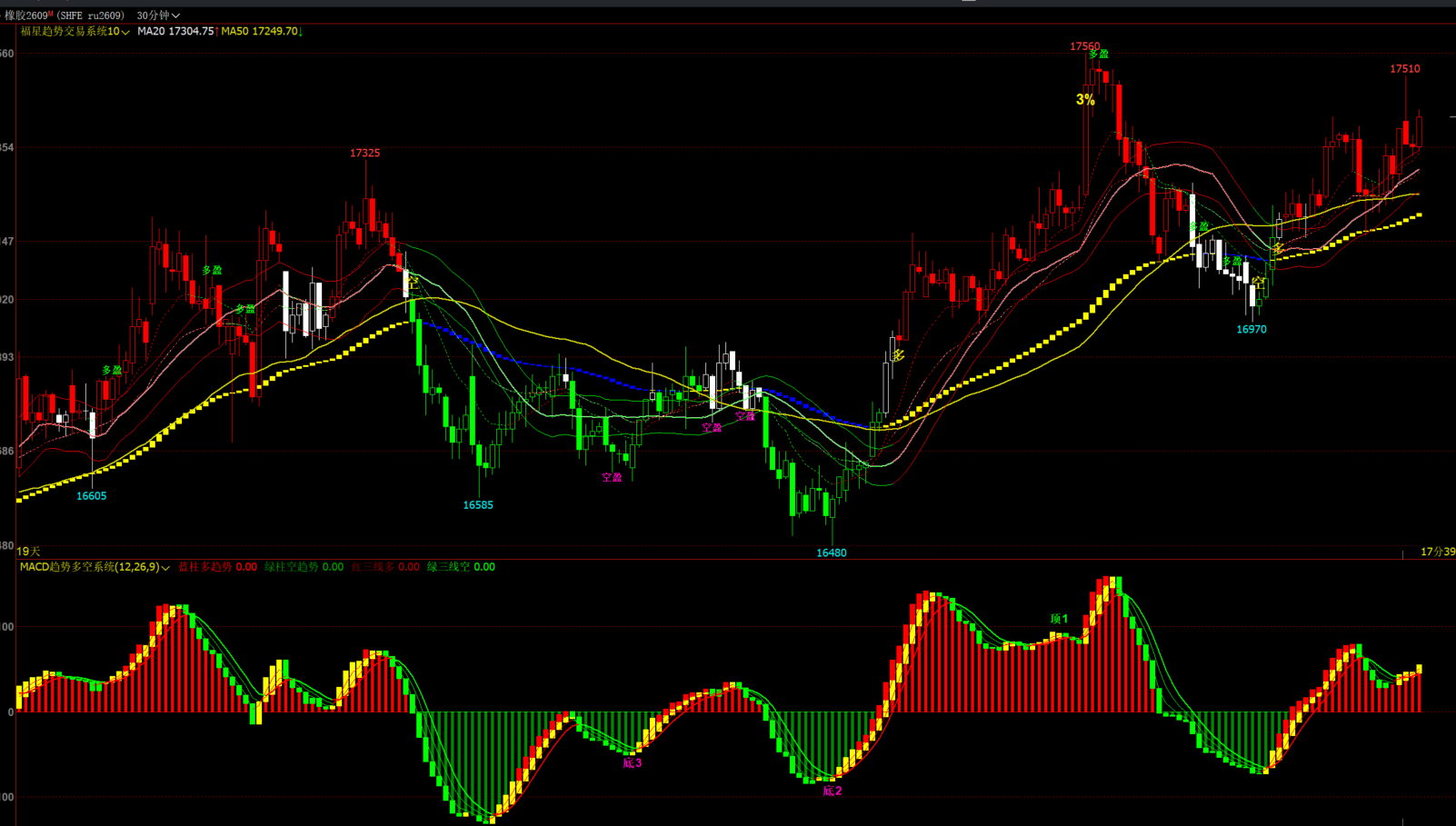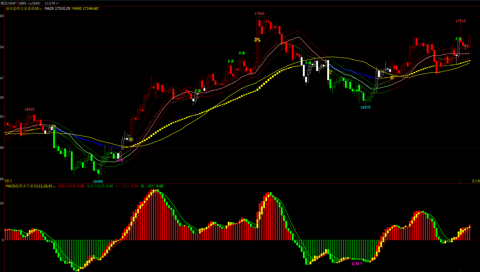 1、指标组成:福星趋势交易系统10主图+MACD趋势多空系统幅图套装指标公式。