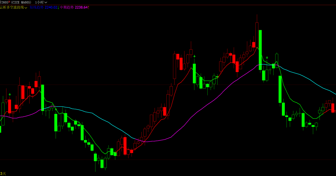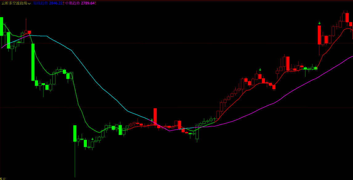 紫线和青色线是趋势多空线,红绿是短线操作线,同时K线进行变色,绿色箭头是多减仓信号。