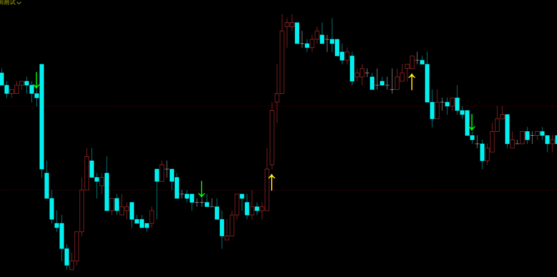 DRAWTEXT(CROSS(CON2&&DB<0,0.5),H,’↓’),VALIGN2,FONTSIZE45,COLORGREEN;