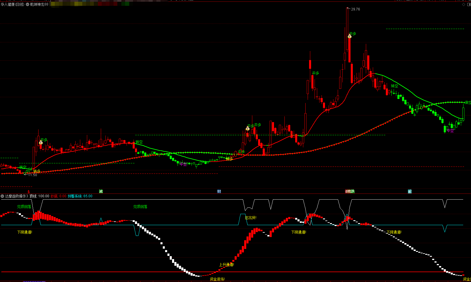 主图(乾坤神龙):核心是红绿圆点趋势线,为多空强弱分水岭,线上持股、线下观望;叠加 “平多 / 转多 / 转空” 信号与多空线,配合 K 线判断趋势拐点,是趋势跟踪主指标。