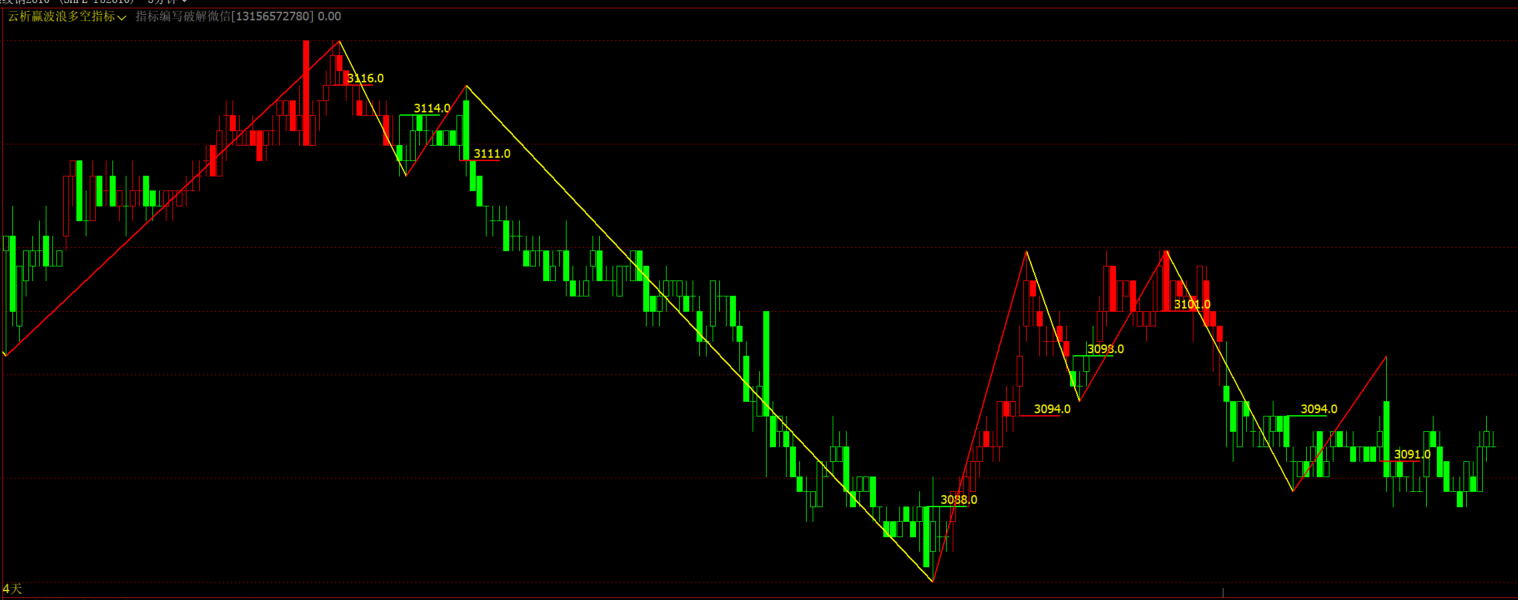 指标内置多条件逻辑算法,能够定位波浪高低拐点,自动绘制趋势结构线并标注关键价位,采用红绿双色区分走势涨跌状态。可自动处理复杂K线组合,优化分型延续与拐点判断逻辑。