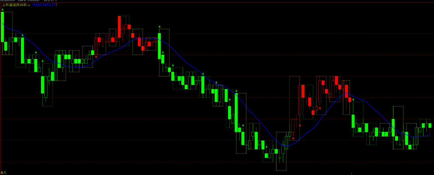 指标是日内周期可视化分析工具,以4根K线为固定周期划分行情区间,自动框选周期内高低价形成虚线边框,用红绿K表示涨跌情况。