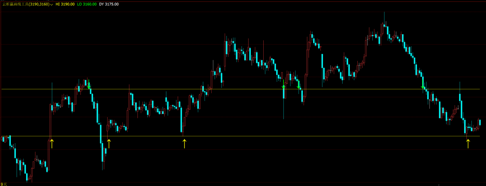 指标采用黄、绿、白三色区分不同价位线,直观醒目,当价格触及阻力线时显示“↓”提示,触及支撑线时显示“↑”提示,信号简洁易懂。